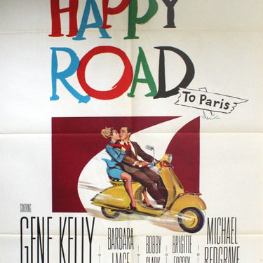 Original vintage cinema poster for the movie produced and directed by Gene Kelly, It Happened on the Happy Road to Paris, starring Gene Kelly, Barbara Laage and Michael Redgrave. Fun and colourful design of a young couple kissing on a speedy scooter with Gene Kelly's face in the Y of the title text formed like a person holding up his arms and a signpost To Paris below the coloured letters and above the road in the image. Good condition, folded as issued.