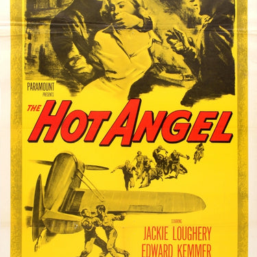 Original vintage movie poster for an American drama film The Hot Angel "Teenage gangs rip highways and skies with thrills and terror!" directed by Joe Parker, written and produced by Stanley Kallis and starring Jackie Loughery, Edward Kemmer and Mason Alan Dinehart. Dynamic design against a yellow background featuring a young lady being held captive by two men above the stylised title text in red with men fighting in front of a plane next to the credit text and a gang of bikers leaving their motorbikes and running towards them. Fair condition, folds and creases, minor tears and paper loss.