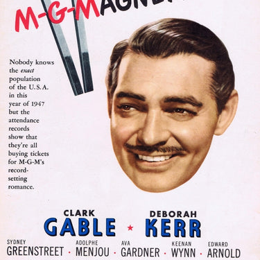 Original movie trade ad for a film, The Hucksters. From the 1920s, film studios would commission the finest artists of the day to create elaborate trade ads, which were sent to cinemas in an effort to get them to book that specific movie. Great artwork by the Romanian American caricaturist, Jacques Kapralik (1906-1960), featuring Clark Gable and Deborah Kerr. High quality printing with embossed gold paint. Kapralik worked with MGM in the 1940s; he designed miniature models resembling the film stars, which were then photographed against backgrounds to give a three-dimensional effect. Good condition, light glue stains on bottom margin of the text side, printed on both sides.