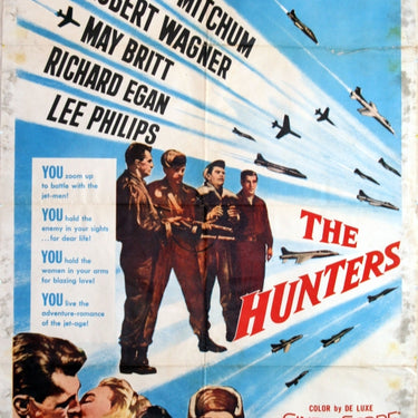 Original vintage film poster for a US movie about the Air Force set during the 1952 Korean War, starring Robert Mitchum, Robert Wagner, May Britt, Richard Egan and Lee Phillips. The caption reads: "You zoom up to battle with the jet-men! You hold the enemy in your sights...for dear life! You hold the women in your arms for blazing love! You live the adventure-romance of the jet-age!" Dynamic image featuring fighter jets and pilots. Folded, watermarks along margins.