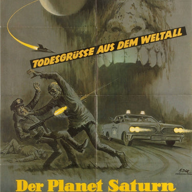 Original vintage movie poster for the 1979 German release of the 1977 American science fiction horror film The Incredible Melting Man / Todesgrusse aus dem Weltall - Der Planet Saturn lasst schon grussen, written and directed by William Sachs and starring Alex Rebar as Steve West (an astronaut exposed to radiation that turns him into a melting man who needs to eat people to survive), Burr DeBenning as Dr Ted Nelson, and Myron Healey as General Michael Perry. Great sci-fi artwork featuring a policeman shooting the zombie melting man attacking him as a police car approaches, a man lying dead on the side and a spaceship flying around Saturn above, in front of a superimposed image of the melting man dominating the background, the title in stylised yellow letters below. Very good condition, folded as issued.