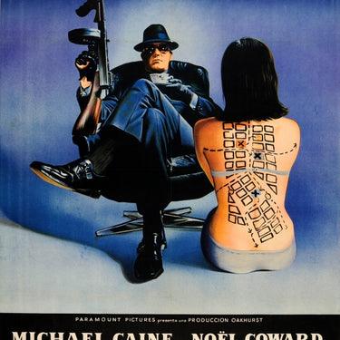 Original vintage movie poster for the Argentinian release of the classic British crime film The Italian Job "Learn the details of a new and productive business" / "Conozca los detalles de Nuevo y productive negocio" Faena a la Italiana directed by Peter Collinson and starring Michael Caine, Noel Coward, Benny Hill, Raf Vallone, Tony Beckley, Rossano Brazzi and Maggie Byle with music by Quincy Jones. Great image of a man wearing a dark glasses, hat and suit, sitting down and holding a cup of tea in one hand and a machine gun in the other with a street map of the heist drawn on a lady's back, visible to the viewer, the text above and below in white letters. Printed in Argentina, Lito Fenix, Humbolot. Good condition, restored pinholes, folds and minor loss and tears, backed on linen.