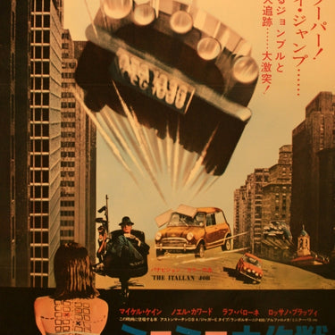 Original vintage cinema poster for the 1969 film, The Italian Job, starring Michael Caine, Noel Coward, Benny Hill and Raf Vallone. Original Japanese release. Excellent condition, folds, one repaired tear.