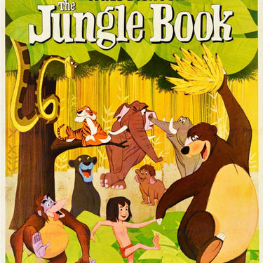 Original vintage film poster for Walt Disney's classic animated family movie The Jungle Book based on the 1894 book by Rudyard Kipling with the voices of Bruce Reitherman as Mowgli the man cub, Phil Harris as Baloo the bear, Sebastian Cabot as Bagheera the panther, Louis Prima as King Louie the ape, George Sanders as Shere Khan the tiger and Sterling Holloway as Kaa the snake. Colourful and fun illustration depicting Mowgli and Baloo holding up a bunch of bananas and leading a dance with the rest of the main cartoon characters in the background, including Colonel Hathi the elephant, below the jungle trees with the slogan above: The Jungle is Jumpin'! Good condition, restored folds, restored paper loss, minor staining, backed on linen.