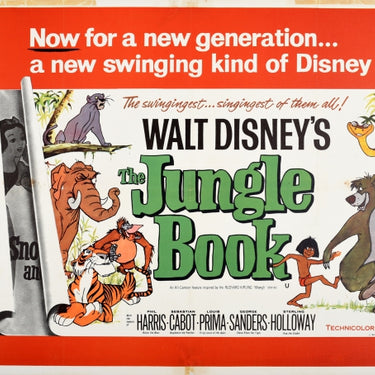 Original vintage British quad film poster for the first release in the UK of Walt Disney's classic animated family movie The Jungle Book - The Swingingest... Singingest of them all! - based on the 1894 book by Rudyard Kipling with the voices of Bruce Reitherman as Mowgli the man cub, Phil Harris as Baloo the bear, Sebastian Cabot as Bagheera the panther, Louis Prima as King Louie the ape, George Sanders as Shere Khan the tiger and Sterling Holloway as Kaa the snake. Fun and colourful artwork featuring Mowgli and Baloo dancing below Kaa in a tree on one side of the bold green title lettering with the other cartoon characters looking at them on the other side, the design showing the paper curling and showing two images in the background in black and white of Snow White and The Seven Dwarfs and Mickey Mouse, with the white lettering on the red border above - Now for a new generation... a new swinging kind of Disney! Horizontal. Fair condition, restored paper losses, tape marks, restored tears and folds, restored paper damage, backed on linen.