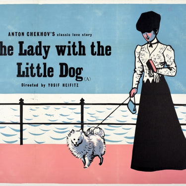 Original vintage movie poster for the UK release of the romantic drama film directed by Iosif Kheifits - Дама с собачкой / The Lady with the Dog - inspired by the classic love story by the renowned Russian writer Anton Chekov about an adulterous affair between Dmitri Gurov (played by Aleksey Batalov) and Anna Sergeyevna (played by Iya Savvina) featuring a great illustration of an elegant lady wearing a black and white dress with a black hat, holding a book and glove in one hand and a small blue bag and lead in her other hand, walking her small fluffy white dog along a beach front promenade with the sea and blue sky in the background. Horizontal. Good condition, restored pinholes, restored paper losses, light staining, backed on linen.