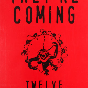 Original vintage advance movie poster announcing the release date for the 1995 science fiction thriller film Twelve Monkeys - They're Coming April 19 - directed by Terry Gilliam and starring Bruce Willis, Madeleine Stowe, Brad Pitt and Christopher Plummer. Great sci-fi design featuring the Twelve Monkeys symbol like a clock face with a larger monkey in the centre set against a red background with the text above and below in stylised black letters. Very good condition, faint scratches and creases in margins.