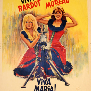 Original vintage movie poster for the film, Viva Maria!, starring Brigitte Bardot, Jeanne Moreau and George Hamilton. Original Belgian release. Fair condition, fold, foxing on margins, repaired tears and minor losses on margins.