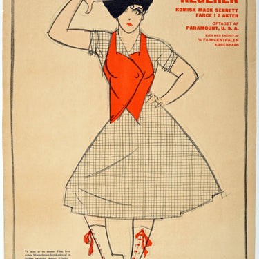 Original antique Danish movie poster for Hvor Kvinder Regerer komisk Mack Sennett farce 1 2 akter / a comedy film produced by Mack Sennett (Michael Sinnott; 1880-1960) Where Women Rule. Great artwork by the notable Danish illustrator, poster designer and commercial artist Sven Brasch (1886-1970) depicting a lady wearing a black and white dress with a red waistcoat and high boots with red laces looking out towards the viewer. Good condition, restored paper loss in top left corner, browning, staining, trimmed edges, backed on linen.