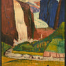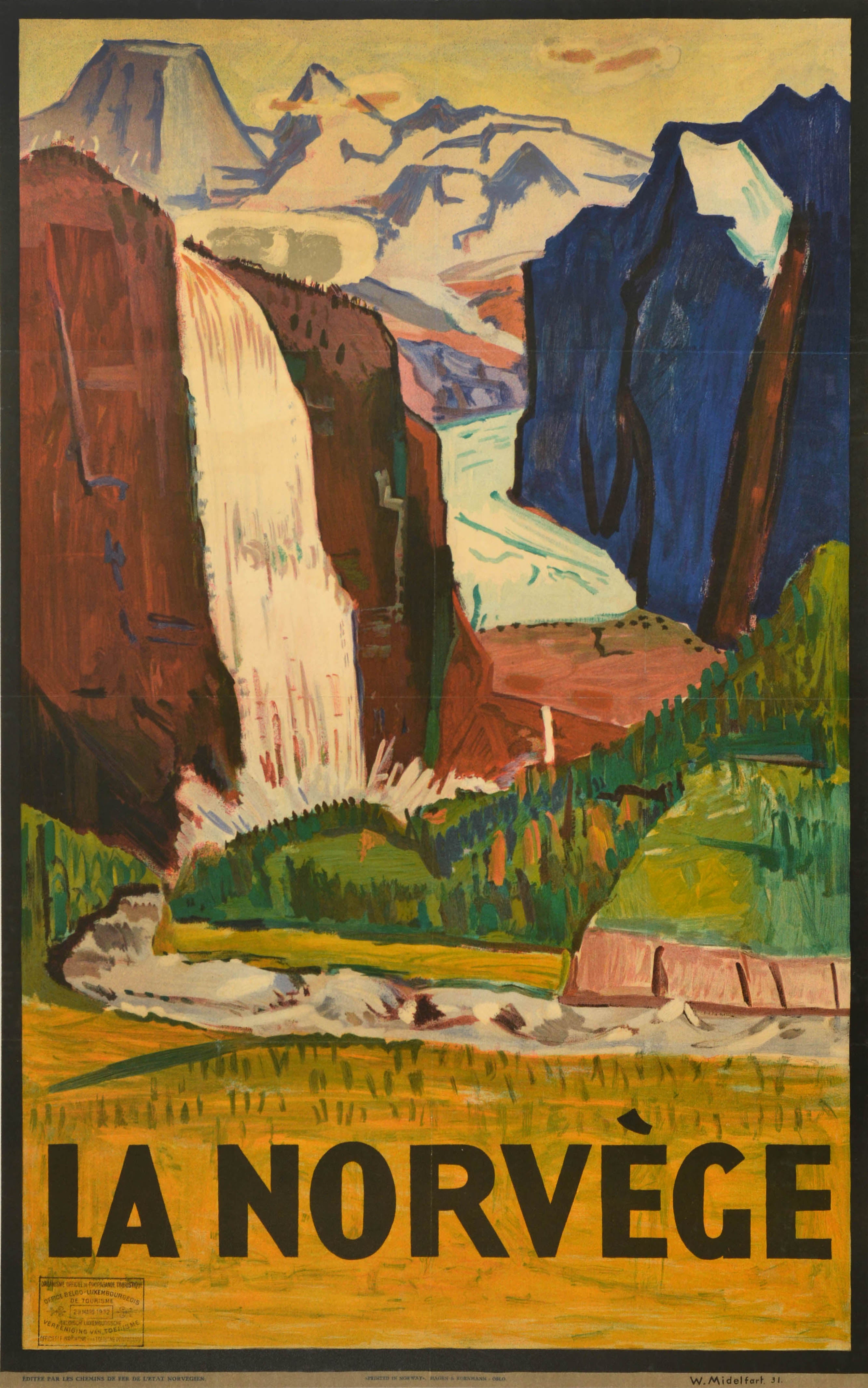 Original vintage travel poster La Norvege / Norway featuring a colourful artwork by Willi Midelfart (1904-1975) depicting a tranquil nature scene, with a waterfall and a river in the foreground and a glacier and mountains in the distance. Published by the Norwegian State Railways. Good condition, restored folds, restored tears, ink stamp, backed on linen.