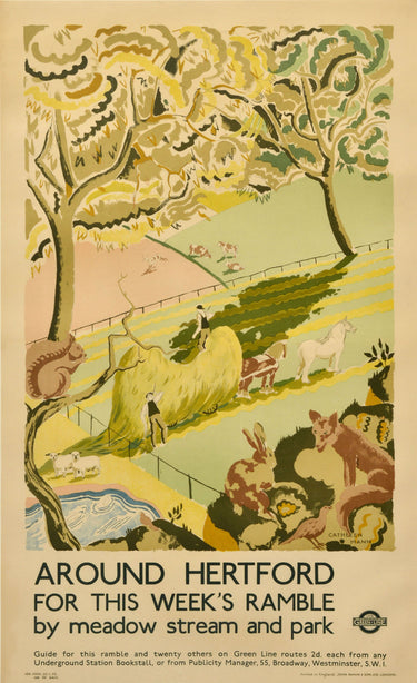 Original vintage London Transport travel poster advertising the Green Line - Around Hertford for this week's ramble by meadow stream and park - featuring great artwork by Cathleen Mann (1896-1959) depicting a country scene showing a squirrel on a tree and a rabbit, fox and bird in a bush in the foreground, two sheep by a lake next to farmers raking hay onto a cart pulled by two horses on a field, and cows in a meadow with leaves and branches of trees in yellows, browns and greens above, the bold title and information text with the Green Line London Underground roundel on the border below. Printed by John Swain & Son. Good condition, folds, restored paper losses, repaired tears, minor creasing, minor staining, backed on linen.
