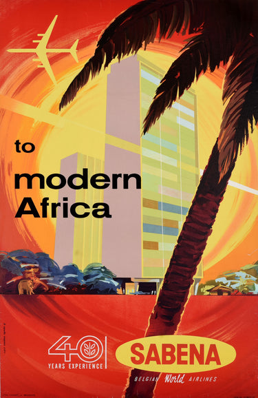 Original vintage travel advertising poster - To Modern Africa issued by Sabena - Design by Gaston Vanden Eynde (1923–1983) features skyscrapers surrounded by trees with a car parked by the entrance, alongside an African elephant and a hut. Palm tree in the foreground set over a red banner with the Sabena logo made to celebrate 40 years of the airline. Sabena (Societe Anonyme Belge d'Exploitation de la Navigation Aerienne), was the national airline of Belgium from 1923-2001. Printed in Brussels. Good condition, restored paper loss in top right corner, restored tears, backed on linen.