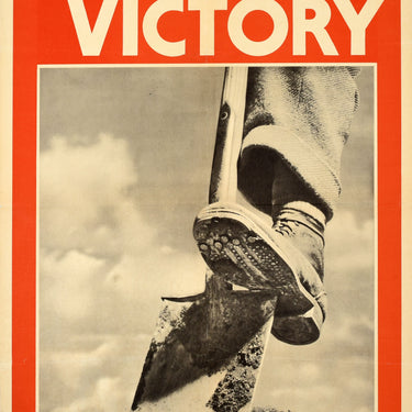 Rare original vintage World War Two propaganda poster - Dig for Victory - featuring the iconic black and white photograph of a worker's foot pushing down on a shovel digging into the earth with the title above in the bold coloured border. Issued for the government's Ministry of Agriculture campaign that encouraged people on the Home Front to grow their own vegetables in food allotments using gardens, parks, sport grounds and other suitable plots of land. Good condition, restored tears, restored folds, small restored paper losses, minor staining, backed on linen.