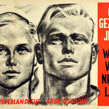 Original vintage World War Two propaganda poster issued by the Dutch Labour Front - Healthy youth work for the Netherlands / Een gezonde jeugd werkt voor Nederland - featuring a black and white pencil illustration of young lady and man facing the viewer, the text on the side in black and white lettering on a red background and in red below. The Dutch Labour Front was a National Socialist Trade Union established in 1942 by a decree of the Reich Commissioner. Horizontal. Good condition, folds, creasing, browning, repaired tears.