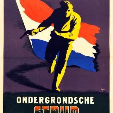 Original vintage poster published after the liberation to honour and celebrate the heroes of the resistance during World War Two - Ondergrondsche Strijd in beeld en document / Underground Battle in image and document compiled by the Information Section At Den Staff Commander of the Netherlands Armed Forces - featuring a dynamic design by the Dutch artist Wim Oepts (1904-1988) of a member of the resistance running towards the viewer with a gun in his hand and the flag of the Netherlands flying in the background, the stylised text below. Printed by Emm. Smeets Weert. Good condition, folds, creasing, pinholes, paper loss in the bottom left corner, tape in the bottom left corner, staining.
