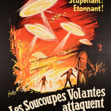 Original vintage science fiction movie poster for Earth vs. The Flying Saucers / Les Soucoupes Volantes Attaquent directed by Fred F. Sears with groundbreaking special effects by Ray Harryhausen and starring Hugh Marlowe, Joan Taylor, Donald Curtis, Morris Ankrum, John Zaremba and Tom Browne Henry. Great sci-fi artwork depicting people running in fear from UFOs and aliens from space as military jet planes attack the flying saucers in the sky above. Issued by Columbia Pictures. Printed in Paris. Large size. Good condition, restored folds, restored paper losses, restored tears, backed on linen.