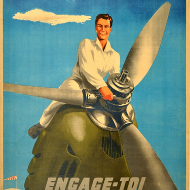 Original vintage World War Two military recruitment poster for the French Air Force - Ton avenir assure par l'acquisition d'un bon metier Engage-toi dans l'armee de l'air / Your future is assured by acquiring a good job Join the air force - featuring an air force engineer in a white work clothing sitting at the front of a spitfire-like plane repairing the propeller and smiling to the viewer as another planes flies by a cloud in the blue sky above. Large size. Good condition, staining, restored tears, pinholes, backed on linen.
