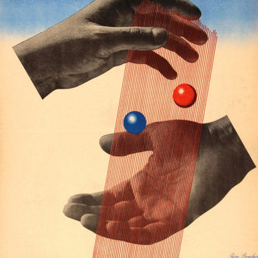 Original vintage advertising poster for the Loterie Nationale / French National Lottery the 13th tranche 1943 - the mutuality issue for the benefit of the national emergency. Great photomontage design by the photographer and artist Pierre Boucher (1908-2000) featuring a black and white photograph of hands with a red and blue ball and red vertical lines between them, the text above and below in colourful stylised letters. Designed and printed by Ste Individuelle D’Imprimerie, Levallois. Good condition, repaired tears on margins.