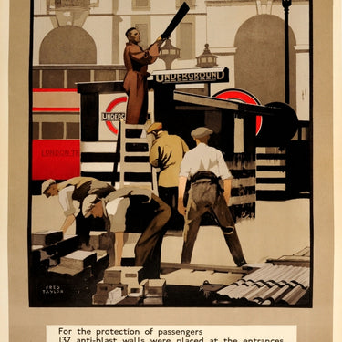 Rare original vintage poster issued by London Underground "Rehabilitation For the protection of passengers 137 anti-blast walls were placed at the entrances to 75 stations. These walls are being demolished as quickly as possible - but It Takes Time" one of a series published after the end of World War Two by London Transport across the London train, tram, bus and underground networks. Great artwork by Fred Taylor (1875-1963) showing workers demolishing an anti-blast wall outside the entrance of an underground tube station with a red London bus passing by in the background, the text above and below. Printed in England by The Baynard Press. Very good condition, restored folds, small pinholes and tears, backed on linen.