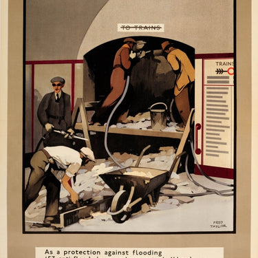 Rare original vintage poster issued by London Underground "Rehabilitation As a protection against flooding 153 anti-flood doors and concrete bulkheads were fitted at 36 stations: a major engineering feat. These obstructions are being removed - but It Takes Time" one of a series published after the end of World War Two by London Transport across the London train, tram, bus and underground networks. Great artwork by Fred Taylor (1875-1963) showing men working in a station removing the concrete blocking the access tunnel to the trains with the text above and below. Printed in England by The Baynard Press. Very good condition, restored folds, small pinholes and tears, backed on linen.