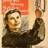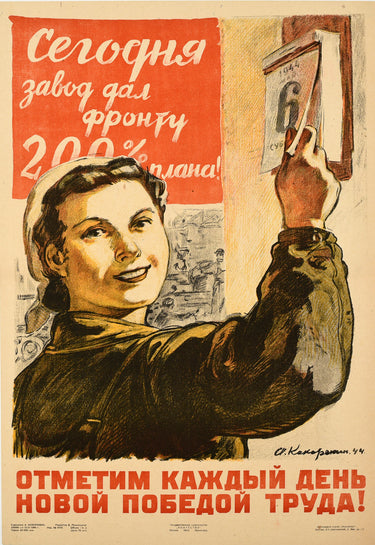 Original vintage Soviet World War Two propaganda poster - Let's Celebrate Every Day With A New Victory of Labour! The factory gave 200% of the plan to the war effort today! - featuring a smiling factory worker looking at the viewer as she tears a date off the 1944 wall calendar in front of an industrial scene in shades of black and white with the factory's achievement that day written in white handwriting style lettering on a red background above, the bold red text below. Excellent condition, backed on linen.