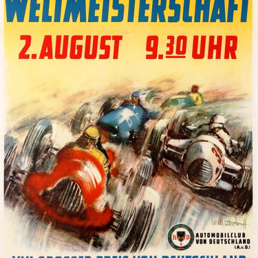 Original vintage F1 motor sport poster advertising the Automobil-Weltmeisterschaft XVI. Grosser Preis Von Deutschland Nürburgring / Automobile World Cup XVI Grand Prix of Germany held at the Nurburgring race track on 2 August 1953. Dynamic design featuring cars racing around a corner at speed with the text above against the yellow background and below with the Automobilclub von Deutschland AvD German Automobile Club logo. The Automobile World Cup is the original name for the Formula One world championships. Very good condition, folds.