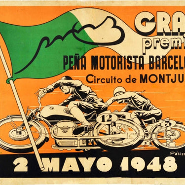 Original vintage motorsport poster for the Gran Premio Pena Motorista Barcelona Circuito de Montjuich / Grand Prix Pena Barcelona Motorcycling Club held on the Montjuic mountain circuit on 2 May 1948 featuring a dynamic design of two motorbike riders on motorcycles numbered 12 and 3 racing by at speed in a GP race below a green and white flag on the orange background, the bold text in stylised lettering above and below. Horizontal. Fair condition, restored paper loss, tears and folds, backed on linen.