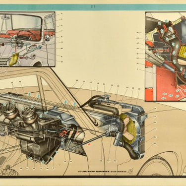 Original vintage car advertising poster for Lada showing the engine in three technical images, the text below - v/o Avtoexport SSSR Moskva / Autoexport USSR Moscow. Manufactured by AvtoVAZ as an affordable car the Russian Лада / Lada brand was launched in 1973 for the export market. Horizontal. Very good condition, creasing, small tears.