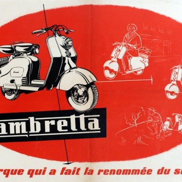 Original vintage advertising poster of the iconic Lambretta scooter - "la marque qui a fait la renommee du scooter" (the brand that made the scooter famous). Black and white on red featuring a Lambretta scooter with images featuring a person in town riding the scooter with bags on the back of it, a mother taking her child to school on a scooter and a man fishing with a scooter behind him. Horizontal. Very good condition, folds, minor bumps on margins.
