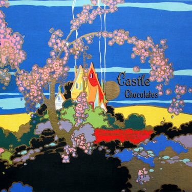 Original vintage food advertising poster for Castle Chocolates featuring a colourful image of a stylised house framed by a blossom tree and flowers in the foreground. Universal Candy Co. Horizontal. Very good condition, folds, backed on linen.