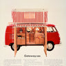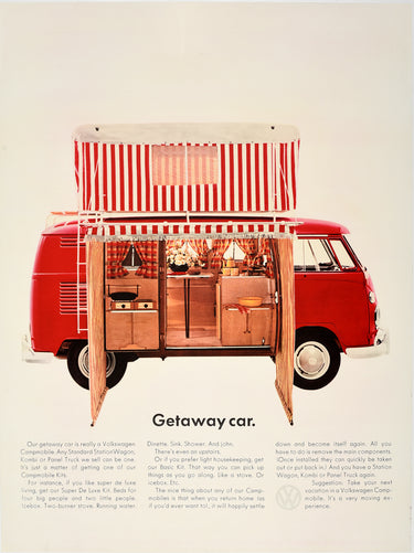Original vintage camper van dealer showroom advertising poster for Volkswagen Getaway Car featuring a great image depicting a smart new red VW Campmobile Station Wagon showing all the facilities inside from the van's open side doors including a two-burner stove for cooking, running water, dinette table and an upstairs room in red and white stripes on the roof with a description of the vehicle below detailing the additional options of a Super De Luxe Kit with beds for four big people and two little people as well as an icebox, sink, shower and john or a Basic Kit for those who prefer light housekeeping with things that can be picked up as you go along, and the benefit of being able to remove the main components when you get home after a road trip to return your Volkswagen back to its original Station Wagon, Combi or Panel Truck model with the "Suggestion: Take your next vacation in a Volkswagen Campmobile. It's a very moving experience." next to the VW logo at the end. The German automobile maker, Volkswagen ("people's car") was founded in 1937; the company's Type 2 Transporter / Kombi / Bus / Camper models (since 1949) became popular during the 1960s hippie era. Good condition, restored paper loss, restored tears, small stain, backed on linen.