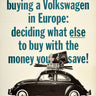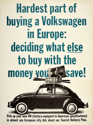 Original vintage car dealer showroom advertising poster for Volkswagen Beetle - Hardest part of buying a Volkswagen in Europe: deciding what else to buy with the money you save! - featuring a great black and white design depicting a smiling man driving a VW Beetle with various items loaded on the roof including a painting, clock, statue bust, skis and a vase with the main text in the background and information below reading: Pick up your new VW (factory-equipped to American specifications) in almost any European city. Ask about our Tourist Delivery Plan. The German automobile maker, Volkswagen ("people's car") was founded in 1937; the company's Type 1 two-door models were first manufactured in 1938, achieving a peak growth in sales and popularity during the 1960s hippie era. Good condition, restored paper loss on corner, tears, some minor stains, backed on linen.