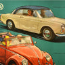 Original vintage advertising poster promoting two Volkswagen models - the Volkswagen 1500 Cabriolet and the Volkswagen 1200 Cabriolet. The dynamic design by Victor Mundorff (1897-1973) features white and red cars with elegantly dressed passengers driving at speed against a bold blue background. The Volkswagen Type 3, marketed as the 1500, was produced from 1961 to 1973 in notchback, fastback, and station wagon variants. A cabriolet version was introduced as a prototype at the 1961 Frankfurt International Motor Show, with only a small number built by Karmann. The Volkswagen 1200 Cabriolet belongs to the iconic Beetle line, which was sold alongside the Type 3 series. Horizontal. Good condition, creasing, tears.