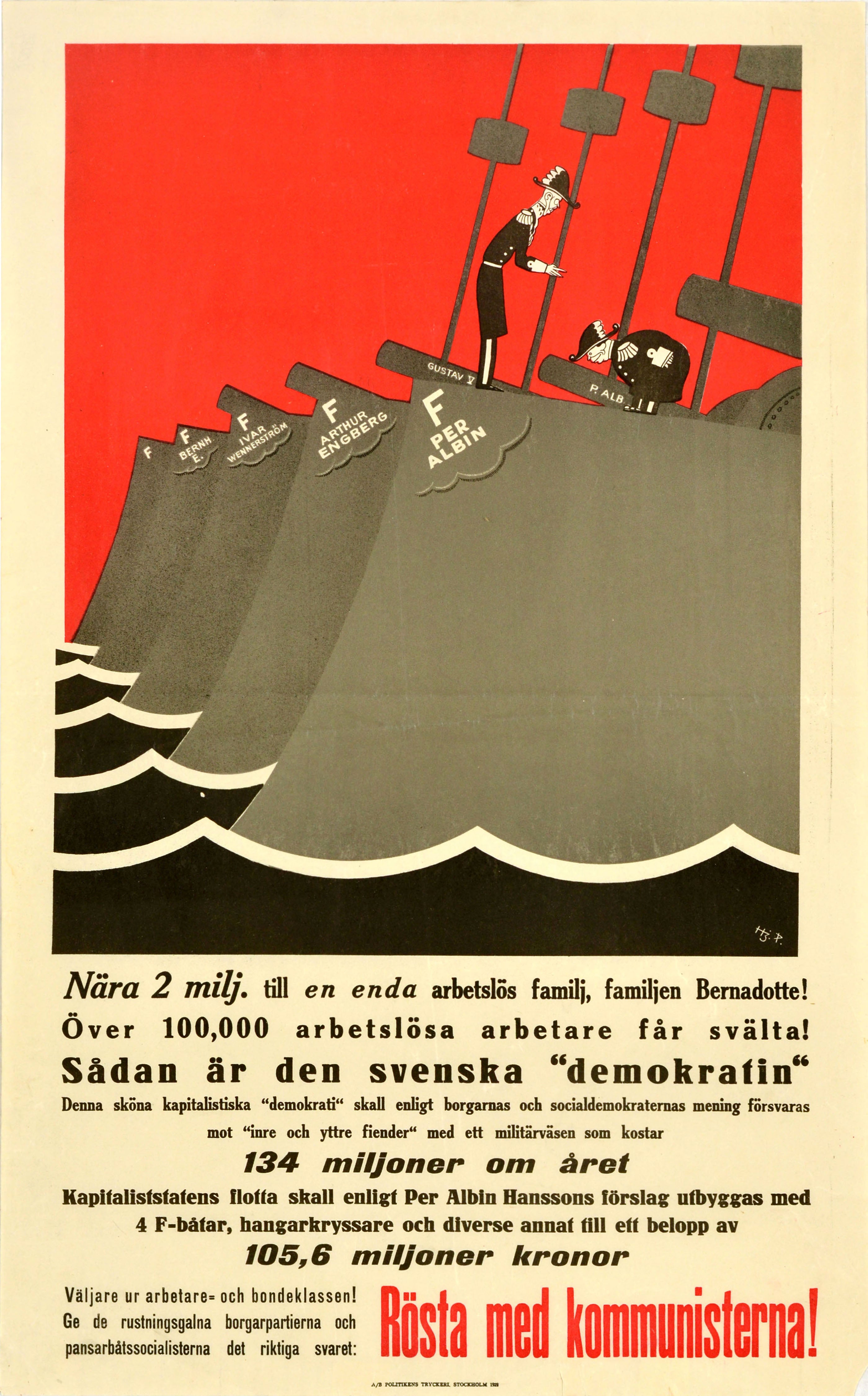 Original vintage propaganda poster Vote with the Communists! / Rösta med kommunisterna! - Design features cartoon sea captains standing on top of a fleet of warships decorated with the name of Swedish Prime Minister Per Albin Hansson, and other Swedish politicians including Arthur Engberg, Ivar Vennerström and Bernhard Eriksson. Message below translates to; Nearly 2 million to a single unemployed family, the Bernadotte family! Over 100,000 unemployed workers are starving! Such is Swedish "democracy". This beautiful capitalist "democracy" must, according to the bourgeois and social democrats, be defended against "internal and external enemies" with a military that costs 134 million a year. According to Per Albin Hansson's proposal, the capitalist state's fleet should be expanded with 4 F-boats, hangar cruisers and various other things to an amount of SEK 105.6 million. Working and peasant class voters! Give the armor-crazy bourgeois parties and the armored boat socialists the real answer: Vote with the Communists! Fair condition, tears, creasing, folds, staining, paper losses.