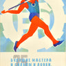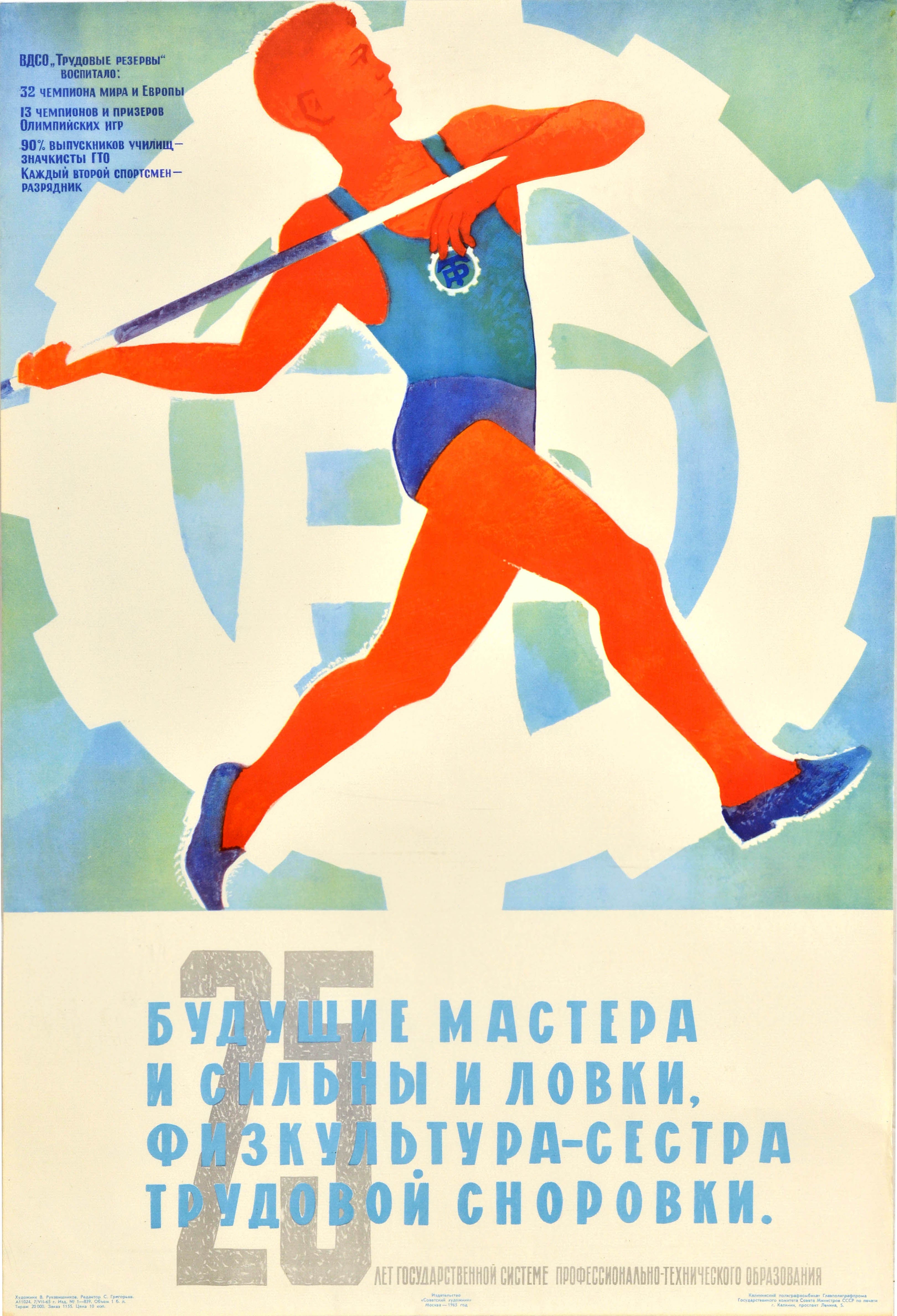 Original vintage Soviet sports poster featuring an illustration of an athlete throwing a javelin in celebration of 25 years of the state system of vocational education with the Voluntary Sports Societies (VSS) of the USSR emblem in the background, the number 25 behind the caption below - Будущие мастера и сильны и ловки, физкультура-сестра трудовой chорoвки / Future masters are both strong and dexterous, physical education is the sister of labour dexterity - and information points above - 32 чемпиона мира и Европы 13 чемпионов и призеров Олимпийских игр 90% выпускников училищ значкисты ГТО Каждый второй спортсмен разрядник / 32 World and Europe champions 13 champions and prize-winners of the Olympic Games 90% of school graduates are GTO trained (Ready for Labour and Defence of the USSR badge holders under the All-Union physical culture training programme) Every second sportsman has an official rating. Very good condition, creasing, minor staining.