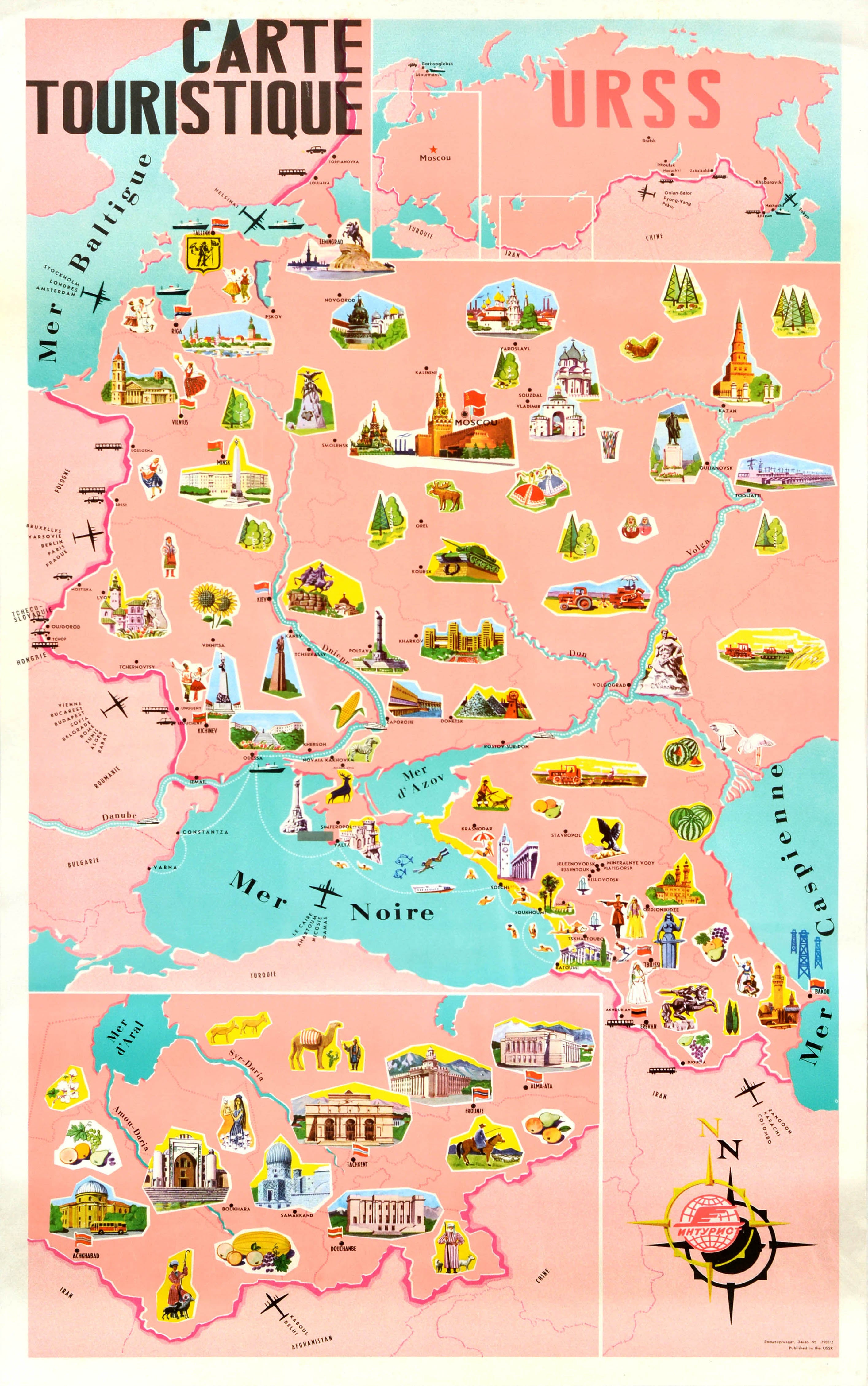 Original vintage travel poster - Carte Touristique URSS / Tourist Map USSR - issued by the state tourism company Intourist featuring an illustrated map of the Soviet Union marking the major tourist attractions including the Moscow Kremlin and other notable buildings, historical and military monuments, trees, rivers, trains, farming and agriculture, people in traditional dress, industry, watermelons and other food, flowers, animals and birds, people dancing, oil rigs on the Caspian Sea, ships and planes, people sunbathing, fish and a person diving in the Black Sea with routes to the USSR marked on the borders, the bold title text and the Baltic Sea marked next to a whole map view above with the compass point next to a smaller map on the side below. Good condition, creasing, staining.