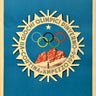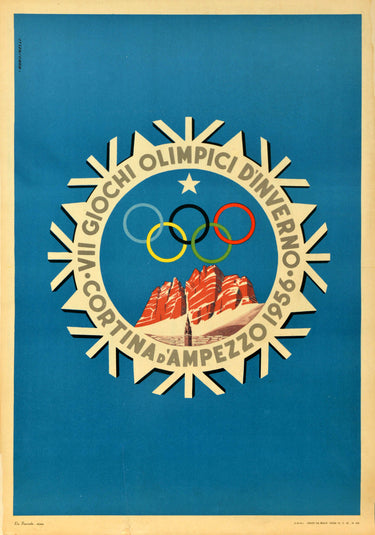 Original vintage Olympics sport poster for the VII Winter Olympic Games held in Cortina d'Ampezzo Italy in 1956 - VII Giochi Olimpici d'Inverno Cortina d'Ampezzo 1956 - featuring a great graphic design depicting a view of the dramatic Dolomites mountains in the Italian Alps below the Olympic Rings logo and white star of the Italian National Olympic Committee (CONI), seen through a stylised snowflake with the title text around this official emblem of the Games on a blue background. This 1956 Winter Olympics was won by the Soviet Union with 16 medals followed by Austria with 11 medals and Finland with 7 medals; it was also the first Winter Games event to be broadcast live on television. Good condition, restored loss on margins, restored tears, minor staining, backed on linen.