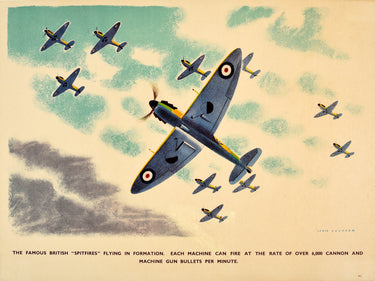 Original vintage World War Two propaganda poster featuring a great illustration by James Gardner (1907-1995) of Royal Air Force RAF Spitfire planes flying in formation with the text below - The famous British "Spitfires" flying in formation. Each machine can fire at the rate of over 6,000 cannon and machine gun bullets per minute. Horizontal. Good condition, restored tears, minor staining, backed on linen.