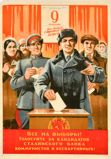 Original vintage Soviet election propaganda poster - Everyone to the polls! Vote for candidates from the Stalin Bloc of Communists and non-party members! 9 February 1947: Election Day for the Supreme Soviet of the RSFSR / Все на выборы! Голосуйте за кандидатов Сталинского блока коммунистов и беспартийных! 9 февраля 1947 День выборов в Верховный Совет РСФСР - issued to encourage voting in the elections, depicting smiling and enthusiastic workers and people of all ages, including a man in military uniform and a lady in a coat and headscarf, holding their ballot papers with the man in the foreground indicating to the viewer to vote while posting his into the ballot box decorated with the hammer and sickle Emblem of the Russian Soviet Federative Socialist Republic, a calendar date on the curtain the background and text on a red banner below. These post World War Two elections were held during the period of ongoing famine and reconstruction with compulsory voting seen as a public duty of loyalty. Good condition, creasing, folds, repaired tears, paper loss in top left corner, sticker on bottom left corner, backed on linen.