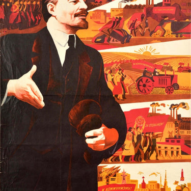 Original vintage Soviet propaganda poster - Glory to the Great October / Слава великому октобрю! - featuring an illustration of Lenin with five images in the background depicting crowds of people carrying red banner flags in front of the battleship Aurora during the 1917 Russian Revolution at the top, industrial workers pushing carts and rail carriages loaded with goods and holding a banner that reads - For industrialisation! - in front of factories and smoking chimneys, farmers on tractors and holding tools in a wheat field with a banner - For Collectivisation! - in front of a rising sun on the horizon, workers holding the coat of arms of the USSR and carrying a banner - For Socialism! - with dams, factories, cranes and coal and oil mining to show progress of their labour, and the bottom image depicting different nationalities of the Soviet Socialist Republics marching with banners reading - To Communism / Bring to life decisions of the 24th Communist Party Congress - in front a science and technology industrial background of construction cranes, a space rocket, satellite and red star on the Moscow Kremlin, the title text in white on a red banner across the top. Fair condition, creasing, tears, folds, paper skimming.