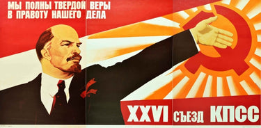 Original vintage Soviet propaganda poster - We Are Full of Faith in the Rightness Of Our Cause - issued for the XXVI Congress of the Communist Party of the Soviet Union, which was held in 1981 and reportedly featured a five-hour address by General Secretary of the Communist Party Leonid Brezhnev. Design features a dramatic image of Lenin looking to one side and gesturing with his hand towards a red USSR hammer and sickle emblem emitting orange rays of light. The background is red with white text. Horizontal. Large size three sheet poster. Good condition, creasing, tears, small paper losses, staining.