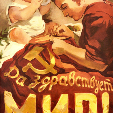 Original vintage Soviet propaganda poster - Long Live Peace! - featuring artwork showing a lady holding a sewing needle and embroidering a red flag with the title text and yellow hammer and sickle emblem on it, a young child sitting next to her drinking from a cup. Good condition, creasing, tears, small paper losses on edges.