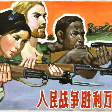 Original vintage Chinese propaganda painted macquet poster - 人民战争胜利万岁!/ Long Live The Victory Of The People's War - featuring an illustration of three people from different countries holding up their guns with soldiers visible in the background, set on an orange sky background with the bold red and blue text below. Horizontal. Good condition, trimmed edges, small tears, pinholes, minor staining.