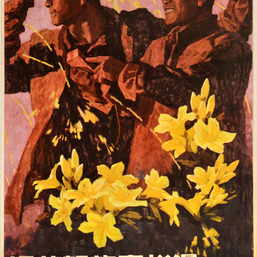 Original vintage Chinese propaganda poster - Melting Steel Sparkles Blossom Like Flowers / 钢花怒放春烂漫 / Gang Hua Nu Fang Chun Lan Man - featuring two steel workers in protective clothing and helmets with yellow sparks flying and yellow lily flowers in the foreground, the bold white Chinese and blue pinyin title text below. Good condition, creasing, tears, folds, minor staining.