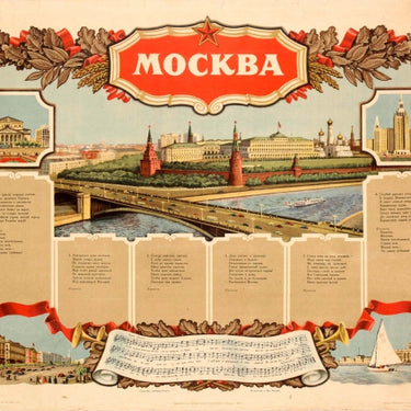 Original vintage Soviet propaganda poster published as part of a campaign aimed at promoting the Socialist homeland from Moscow as the centre of the Soviet way of life to the population living in the Soviet Union. Great design featuring a scenic view of the Kremlin surrounded by trees with the golden domes, red stars and red flag rising into a blue sky, with cars, buses and people crossing the Bolshoy Kamenny Bridge over the Moskva / Moscow River in the foreground, and smaller images depicting more views including the Bolshoi Theatre and a sailing boat on the river, the title above in stylised letters against a red background over a decorative border of wheat and oak tree leaves entwined with a red ribbon leading to a music sheet and lyrics of Москва майская "Утро красит нежным светом..." / Moscow May "Morning paints with gentle light..." decorated with trumpets below. The words to Moscow May (1937, 1959) were written by Vasily Lebedev-Kumach and the music was written by the brothers Dmitri and Daniil Pokrassy. Horizontal. Fair condition, tears and creases in top and bottom margins.