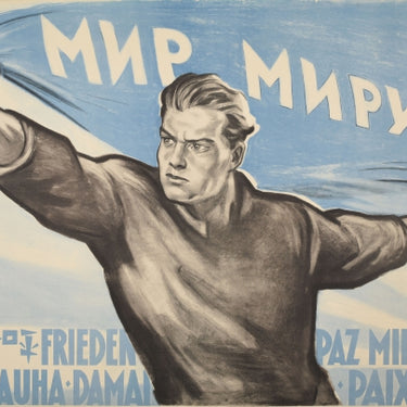 Original vintage Soviet propaganda poster - Peace to the World / Мир Миру! - featuring a dynamic design depicting a man in black and white waving a sky blue coloured flag with the title text on it in bold white lettering, the word Peace below in different languages - Peace 和平 Frieden Paz Mir Pokoj Fred Rauha Damai Paix. Horizontal. Good condition, restored tears, minor creasing, backed on linen.