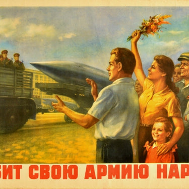 Original vintage Soviet propaganda poster - The people love their army! - featuring a family with the father clapping, the mother waving a bunch of flowers and child smiling with workers and people in the crowd watching a parade and holding red flags in support of the military procession passing by, the soldiers in uniform armed with guns looking out from a transporter trailing a large ballistic missile in front of a building below the blue sky, the slogan in bold red lettering below. Artwork by Alexander Kruchina (1905-1987). Horizontal. Very good condition, creasing.