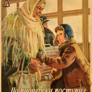 Original vintage Soviet propaganda poster promoting respectful conduct, discipline and good manners - He acted like a pioneer: he gave up a seat to an old lady - featuring an image of a polite young boy in a winter coat, hat and mittens indicating to an elderly lady in a headscarf holding a bag over her arm to take his seat on the train carriage, a man sitting looking out of the window in the background and the stylised text below. The Young Pioneers was a Soviet youth organisation (similar to the Boy Scouts and Girl Guides groups). Fair condition, creasing, tears, staining, paper losses, tape on edges, pinholes.
