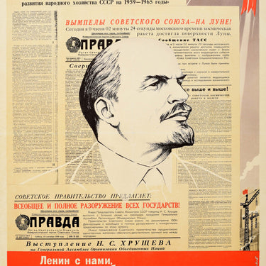 Original vintage Soviet propaganda poster with a poem by Vladimir Mayakovsky (1893-1930) in white on a red background - Lenin is with us, eternal and majestic, his thoughts, words and deeds spread through the Galaxy / Ленин с нами, по всей вселенной бессмертен и величав, ширится шествие-мыслей, слов и дел Ильича - below an image of Lenin (Vladimir Ilyich Ulyanov; 1870-9124) over the front pages of the Russian newspaper Pravda with a rocket in red featuring the Soviet hammer and sickle emblem on it shooting into space on the side above and construction cranes flying a red flag below. Artwork by Nikolai Dolgorukov (1902-1980). The Pravda / Truth newspaper was founded in 1912 as the official paper of the Communist Party until the dissolution of the Soviet Union in 1991. Good condition, restored paper loss on top edge, restored tears, restored folds, restored pinholes, staining, backed on linen.