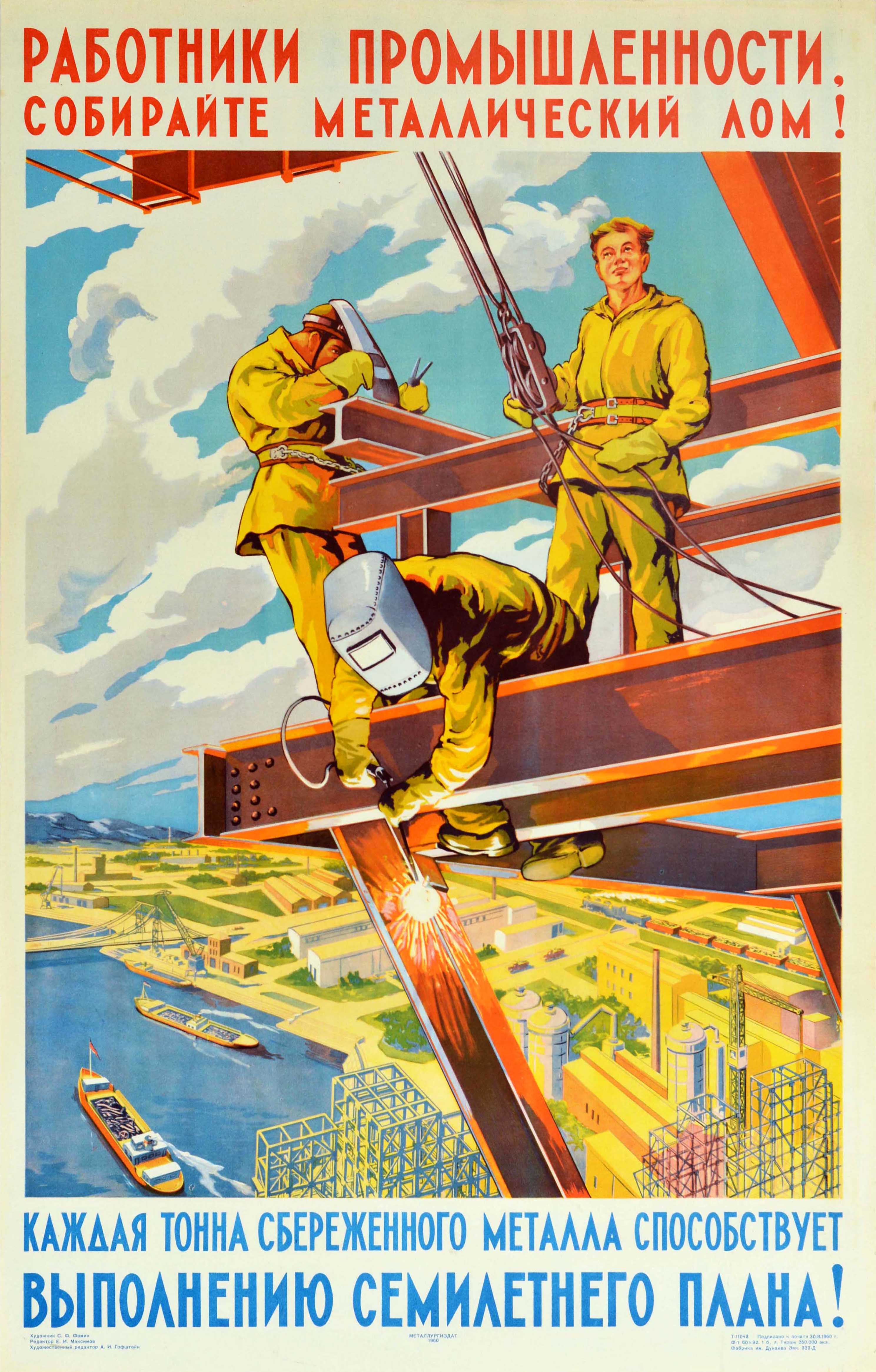 Original vintage Soviet propaganda poster encouraging workers to save and recycle spare metal - Workers of Industry Collect Scrap Metal! Every Ton of Saved Metal Facilitates the Completion of the Seven Year Plan! - showing three construction workers in overalls and helmets, attached to safety harnesses welding and working on a red metal beams high up against the cloudy sky over the industrial factories below, a cargo train running along the railway and large container ships sailing on a river by a construction site and bridge with hills visible in the distance. Published in the USSR by Metallurgizdat in 1960. Excellent condition, minor creasing.